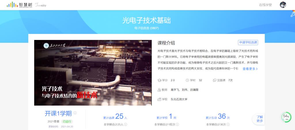 近日,由公司牟海维教授策划,高宇飞老师和刘伟老师担任主讲的《光电子技术基础》课程在“智慧树在线教育平台”正式上线运行,并于4月20日面向校内外员工正式开课。