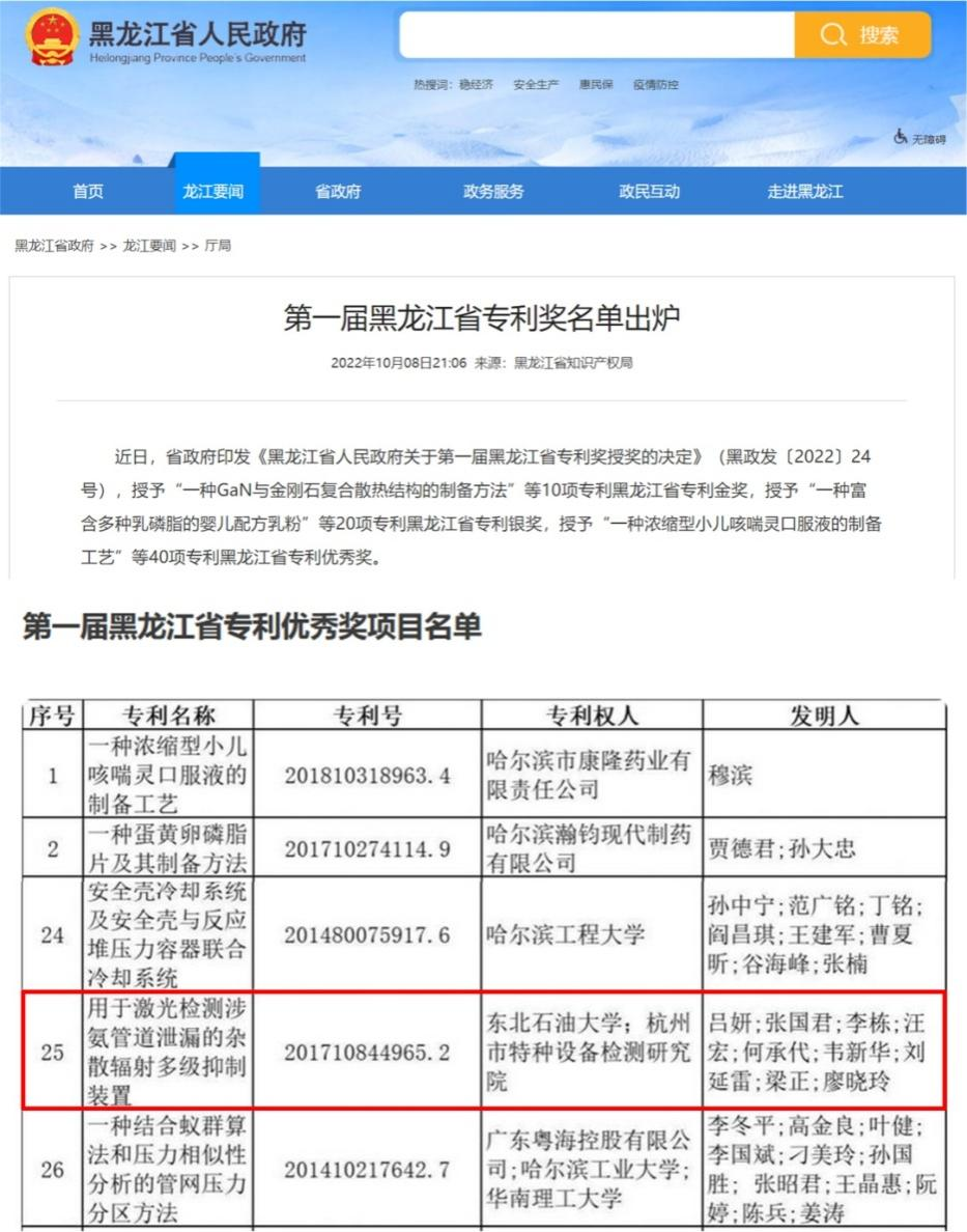 黑龙江省知识产权局于2022年10月8日正式公布了《黑龙江省人民政府关于第一届黑龙江省专利奖授奖的决定》,公司吕妍副教授作为第一发明人取得的国家发明专利“用于激光检测涉氨管道泄漏的杂散辐射多级抑制装置”(专利号:ZL 201710844965.2)荣获黑龙江省专利奖优秀奖。