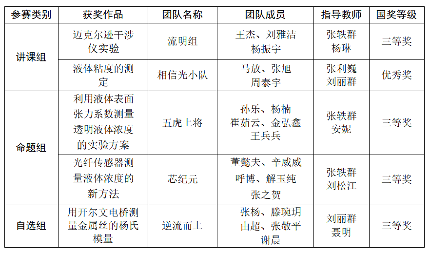 命题组赛道,化工20-4班孙乐同学带领的团队凭借作品“利用液体表面张力系数测量透明液体浓度的实验方案”荣获全国三等奖;电子20-3班董懿夫同学带领的团队凭借作品“光纤传感器测量液体浓度的新方法”荣获全国三等奖。