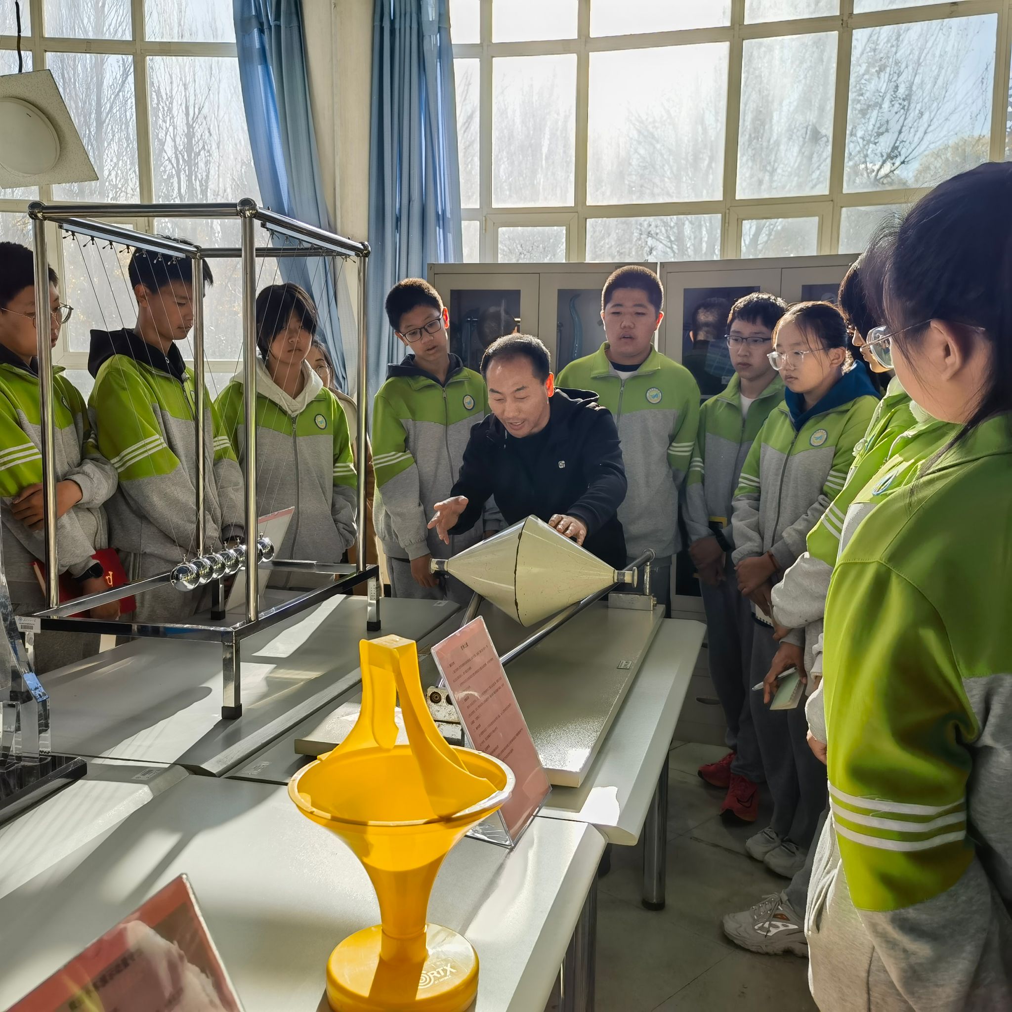 仪式后,大庆市三永公司组织了160余名师生参观了“物理探索演示厅”。U8国际组织经验丰富的物理教师为同学们演示并讲解了傅科摆、超导磁悬浮列车、环驻波演示仪、昆特管、大型蛇形摆、普氏摆、光琴、雅各布天梯等实验,通过丰富多彩的实验现象,充分展示了力、热、电、光、近代物理、天文、通信、传感技术等科学知识的魅力。参观过程中,同学们热情高涨,积极动手实践,沉浸在声、光、电的神奇世界中,流连忘返。