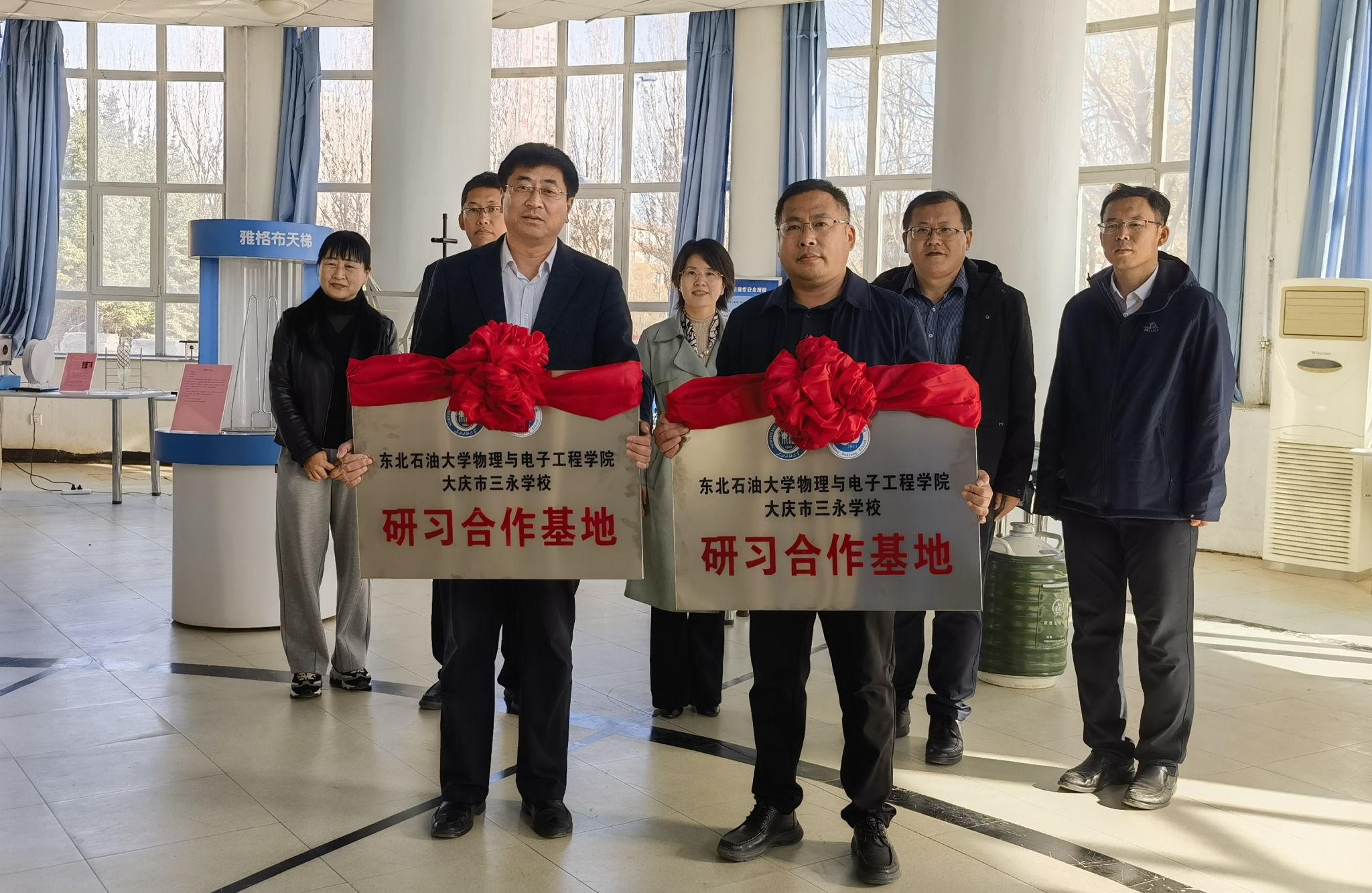 为贯彻党的二十大精神,深入学习习近平总书记关于教育的重要论述,进一步加强高校与中学的深入合作,推动高校资源向社会开放,增强公司社会服务能力,2023年10月18日,U8国际与大庆市三永公司共建的“研习合作基地”在U8国际举行了挂牌仪式。U8国际经理韩建、物理系主任、大学物理实验中心主任,大庆市三永公司党委书记陈向东、教学董事长、教务处主任以及其他教师代表参加了挂牌仪式。