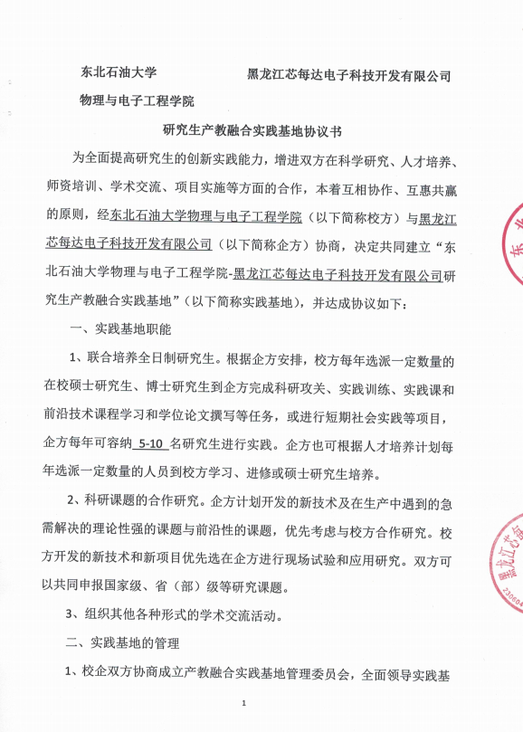 黑龙江芯每达电子科技开发有限公司总经理孟凡涛热情接待了公司一行,介绍了公司发展情况、技术产品、研发中心和服务领域。韩建经理介绍了公司公司产品、学科方向和科研优势,希望通过校企合作加强研究生实践能力的培养,实现合作共赢,助力企业发展。座谈后双方签署了产教融合实践基地协议书,并进行基地挂牌。