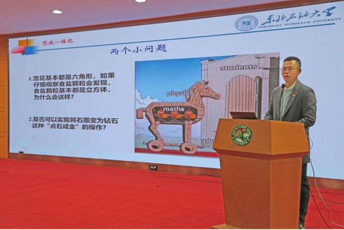 公司应用物理系吴刚副教授以《高压下的物理学新现象》为题,从“两个小问题”切入展开,讲解高压下碳元素单质的物理变化、高压下的超导体特性等有趣的物理知识。