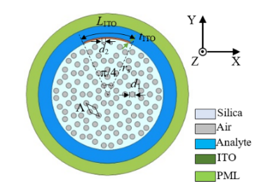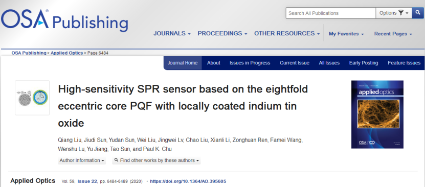 近日,公司2018级硕士生孙久帝又在《Applied Optics》(中科院JCR三区,IF=1.961)发表了一篇关于光子准晶光纤表面等离子体共振折射率传感器的科研成果(题为High-sensitivity SPR sensor based on eight-fold eccentric core PQF with locally coated indium tin oxide)。该成果设计了一种基于八重偏芯结构的光子准晶体光纤,并采用光纤表面局部涂覆等离子体材料的方法避免传感器产生高阶损耗,有效提高了折射率测量灵敏度。在折射率为1.380-1.413的检测范围内,波长灵敏度高达96667nm/RIU,折射率分辨率为1.034×10-6RIU。相关研究工作已申报发明专利。