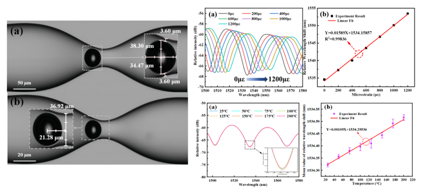 近日,公司2022级硕士研究生李薇在光纤传感团队吕靖薇老师的指导下,在国际权威光学SCI期刊《Optics Express》(中科院2区TOP;IF=3.8)上发表了题为“High-sensitivity strain sensor based on an asymmetric tapered air microbubble Fabry-Pérot interferometer with an ultrathin wall”的研究论文,该研究提出了一种具有非对称锥形结构和超薄壁空气微泡的法布里-珀罗干涉传感器。这种独特的非对称结构使微气泡在应力作用下更容易变形,实验证明,传感器的应变灵敏度高达15.89 pm/με。在25-200 ℃的温度范围内,传感器的温度灵敏度和交叉灵敏度分别为1.09 pm/℃和0.069 με/℃,减少了温度变化引起的测量误差。该成果为复杂环境下的应变测量提供了新的方法,具有很高的商业潜力。