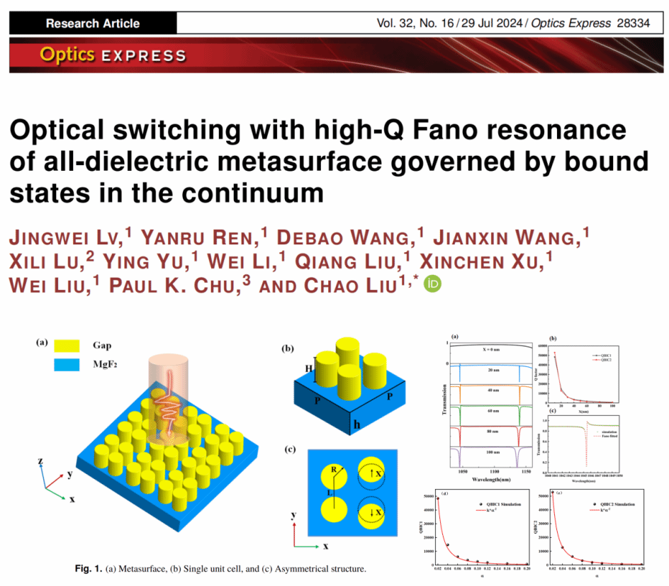 基于BIC效应,公司2022级硕士研究生任艳茹在导师吕靖薇老师的指导下,设计分析了一种由MgF2衬底和四个磷化镓(Gap)圆柱体组成的全介电超表面,可同时实现光开关和传感器两项应用。通过移动圆柱体打破对称性,可实现Symmetry-protected BIC到Quasi-BIC的过渡,在1045.4 nm和1139.6 nm处激发尖锐的双波段Fano共振,最大Q因子达到1.47 × 104和 1.28 × 104,最大灵敏度(S)和品质因数(FOM)分别为488.9 nm/RIU和2.51 × 105RIU-1。成果发表在国际光学领域权威期刊《Optics Express》(中科院二区TOP,IF=3.8),该研究进一步推动了高性能光子器件的开发和应用。