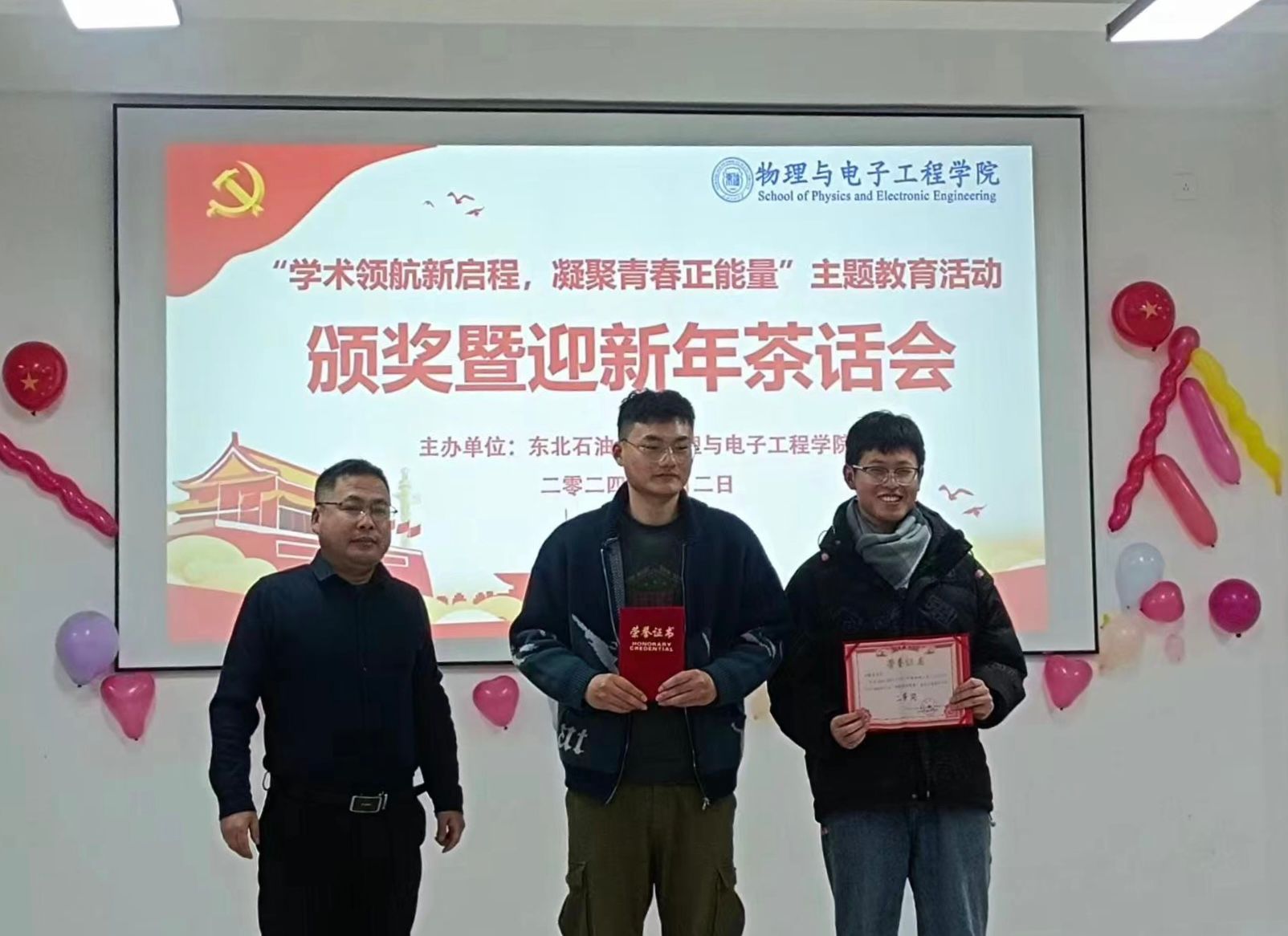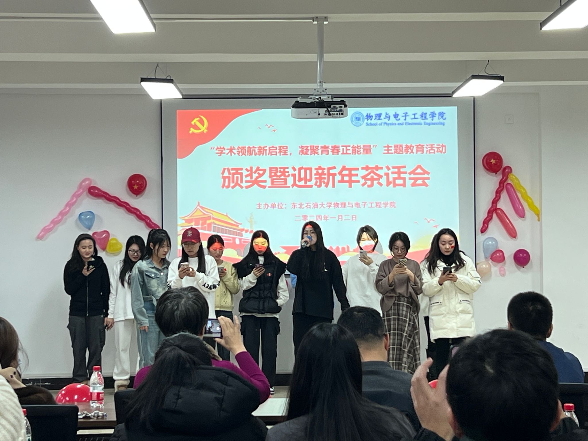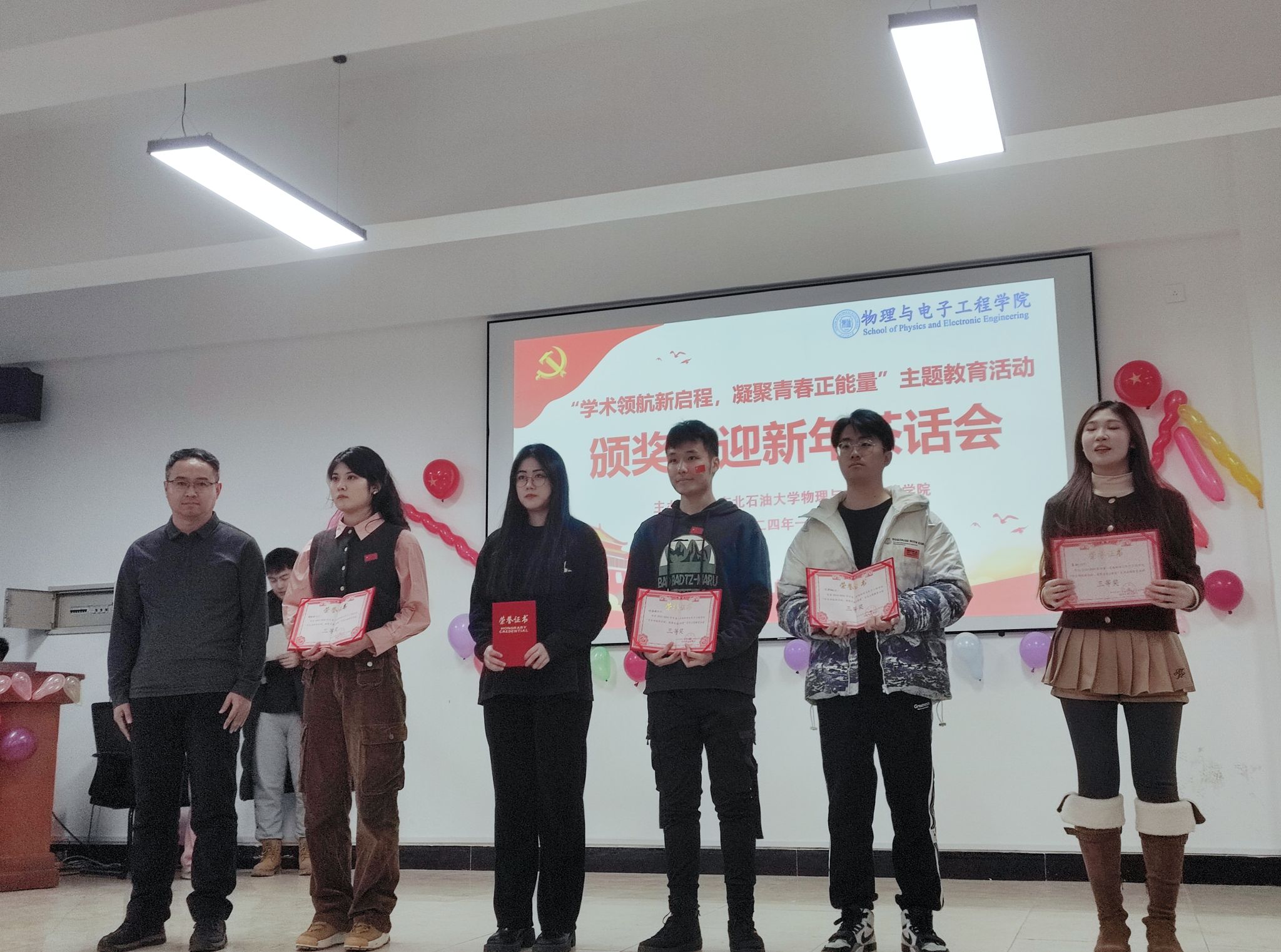 最后,公司于2024年1月2日开展了“学术领航新启程,凝聚青春正能量”主题教育活动颁奖暨迎新年茶话会,参会领导有:党委书记刘超、经理韩建、党委副书记王东明、副经理罗伟、副经理刘强。根据积分排序,本次主题教育活动共设奖励三个等级,在颁奖会上,公司领导为获奖同学代表颁发了荣誉证书,极大地鼓励了研究生的活动热情。在迎新年茶话会上,同学们通过歌唱、舞蹈、游戏等丰富多彩的表演形式给大家带来了一场视听盛宴,整场演出气氛热烈,掌声不断,为庆祝新年的到来增添了浓厚的氛围。