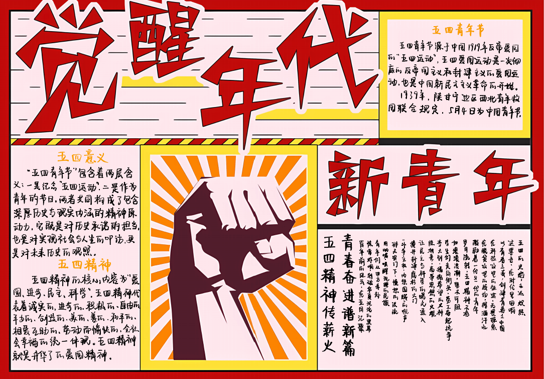 “五四精神传薪火,青春奋进谱新篇”主题手抄报活动自即日起至5月20日止。各小组积极响应,围绕“五四运动”的历史事件、代表人物、精神内涵在当代的体现与传承等主题,创作出了一幅幅主题鲜明、内容积极健康、富有思想性的手抄报作品。同学们充分发挥创意,运用丰富的色彩和生动的图案,将五四精神巧妙地融入作品中。这些电子版作品以PDF、JPEG或PNG等格式提交,页面尺寸规范,分辨率清晰,展现了同学们扎实的设计能力和对五四精神的深刻理解。