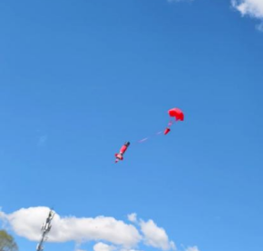 到了"水瓶火箭" 发射环节。物理科普宣讲团成员屈晟轩、仲宇铭、梁光进、赵佳鑫等人将在物理学术竞赛中精心设计制作的实验装置 ——"水瓶火箭" 搬到场地中央。他们熟练地安装火箭,注入定量清水,然后利用打气筒增加瓶内气压。当气压达到临界值时,只听 "咻" 的一声,水瓶火箭腾空而起,尾部喷射水雾划出抛物线后缓缓降落。孩子们被这一神奇现象深深吸引,目不转睛地追踪火箭轨迹,眼中闪烁着对科学的向往之光。