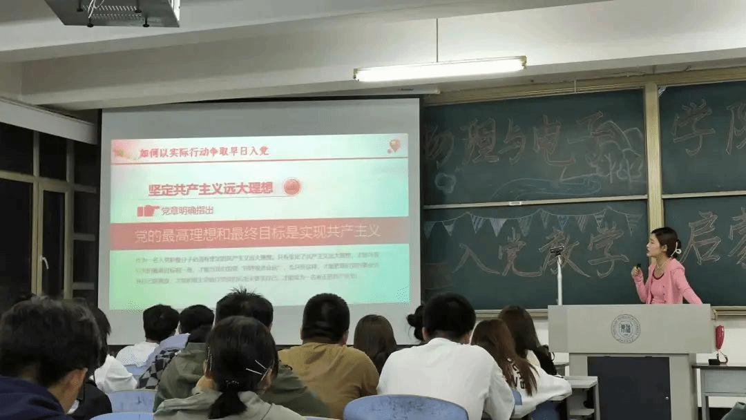一个信念跟党走,颗颗红心报党恩。入党,对于刚进大学的同学们而言是一个全新的概念。大家往往怀着崇拜、茫然等心情看待入党问题。为了打消同学们心中的疑惑,刘老师从三方面讲解了如何端正入党动机。一是对党的认识以及党员的权利和义务;二是如何树立正确的入党动机,刘老师强调:“党员要坚持人民的利益高于一切,当与个人利益发生矛盾时,要毫不犹豫地选择党和人民的利益”;三是如何以实际行动争取早日入党,那便是端正入党动机,只有坚定入党的决心,才能通过党组织的考察。最后刘老师强调:“要坚定共产主义远大理想,党的最高理想和最终目标是实现共产主义。”